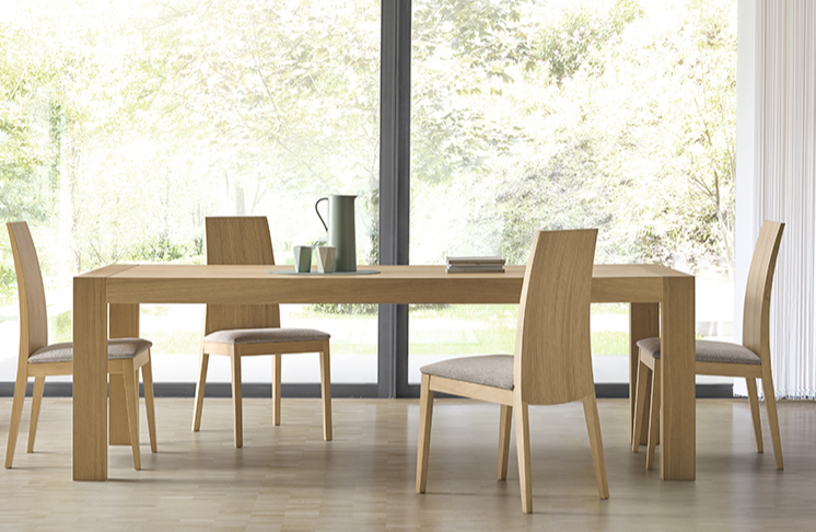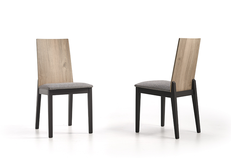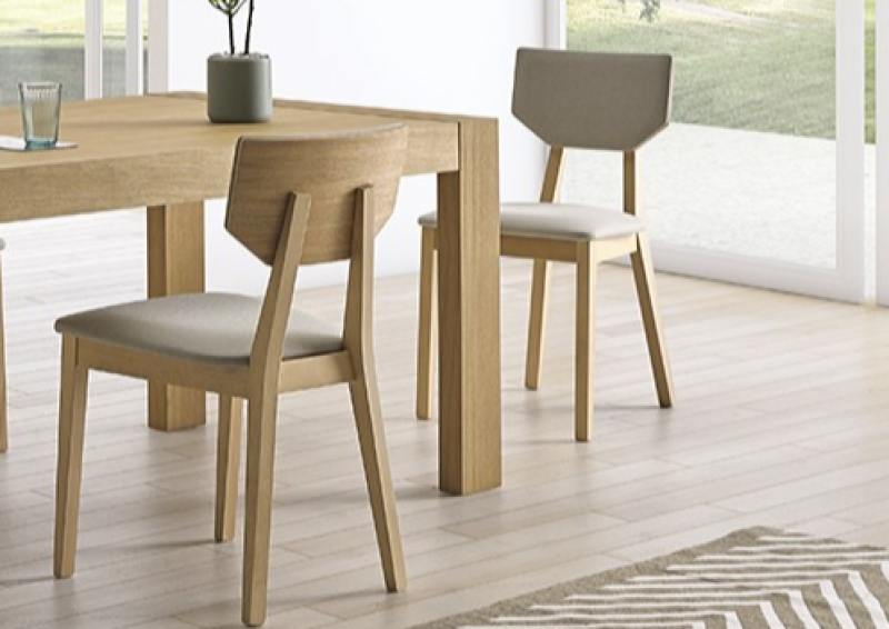 - Silla de madera de haya con respaldo en forma geométrica y con un sutil tapizado en asiento y respaldo