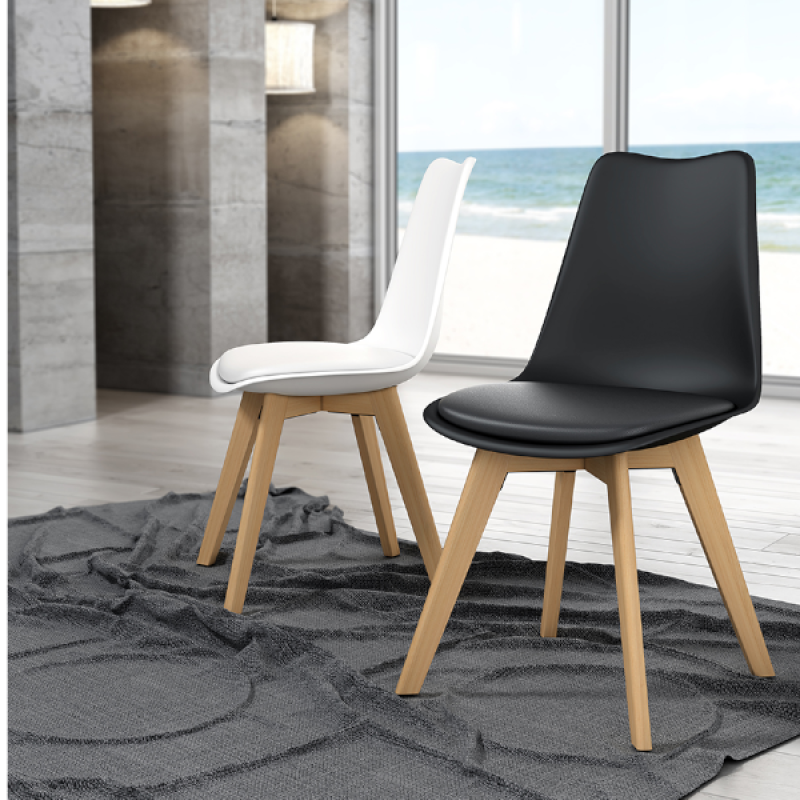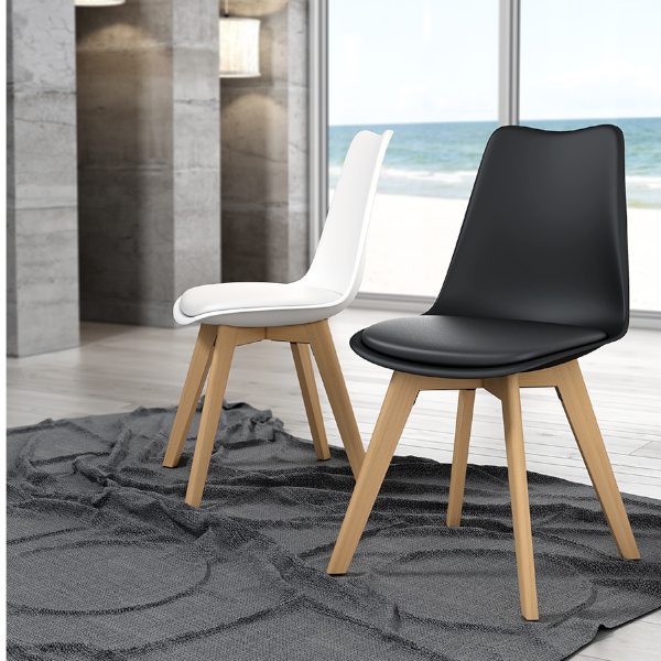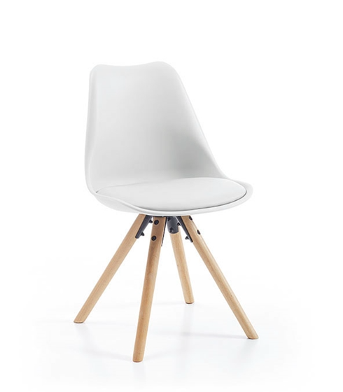 - SIlla con estructura de polipropileno y asiento de piel sintética, patas gruesas y redondas de madera de Haya